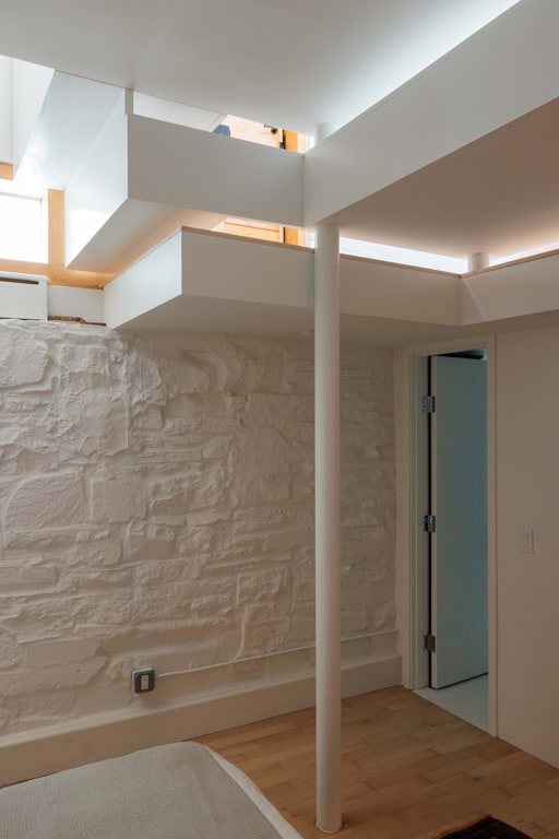 The interior was reconfigured during this renovation to create better circulation between levels and more vertical connection. A mezzanine was added.